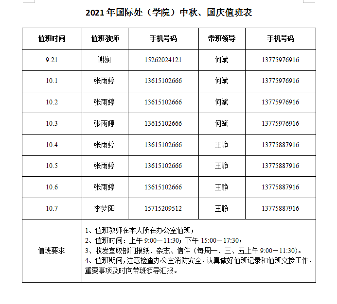 2021年国际处(学院)中秋、国庆值班表