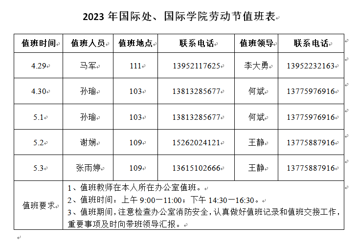 2023年国际处、国际学院劳动节值班表