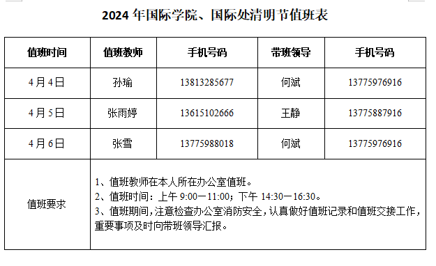 2024年国际学院、国际处清明节值班表